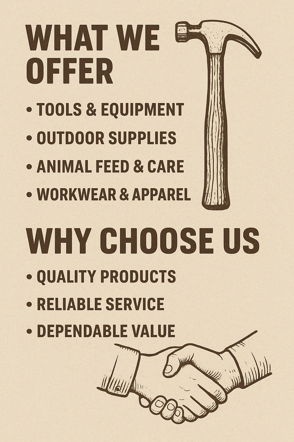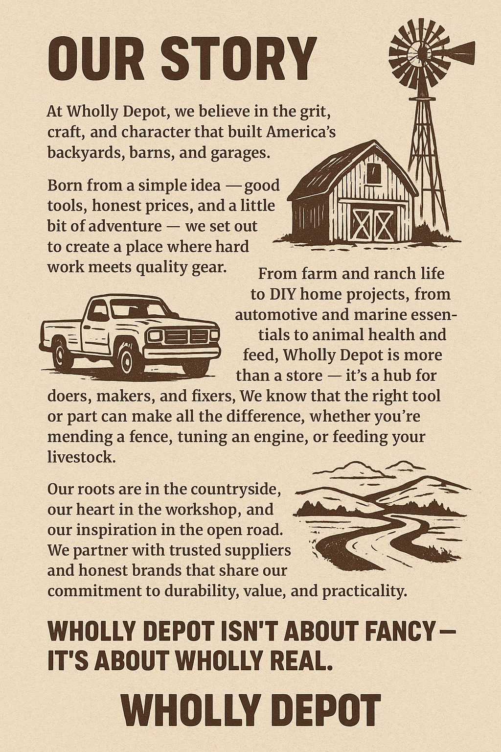 At Wholly Depot, we believe in the grit, craft, and character that built America's backyards, barns, and garages. Born from a simple idea - good tools, honest prices, and a little bit of adventure -we set out to create a place where hard work meets quality gear