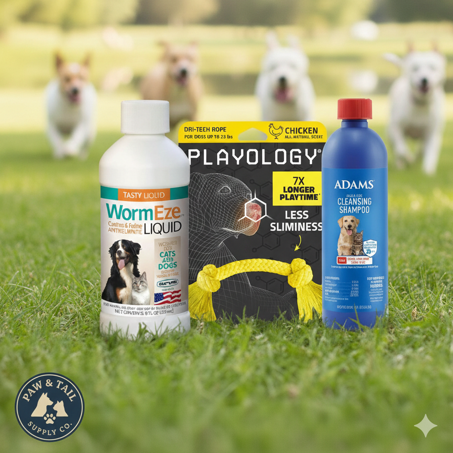 ✔ WormEze 8oz – Easy-to-administer liquid dewormer ✔ Adams Flea & Tick Cleansing Shampoo 12oz – Deep cleansing formula to help remove fleas and debris ✔ Playology Dri-Tech Rope Toy (Small) – Chicken scented interactive chew toy
