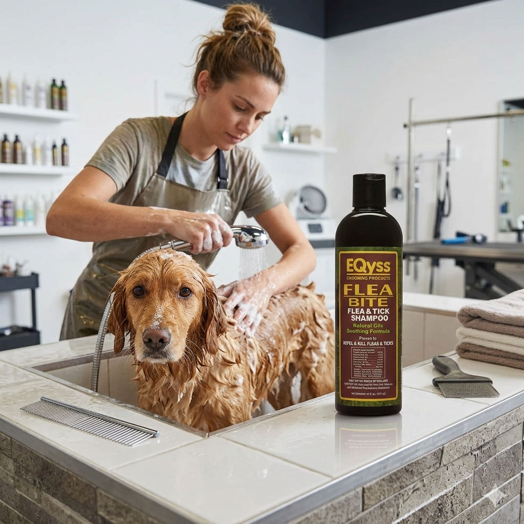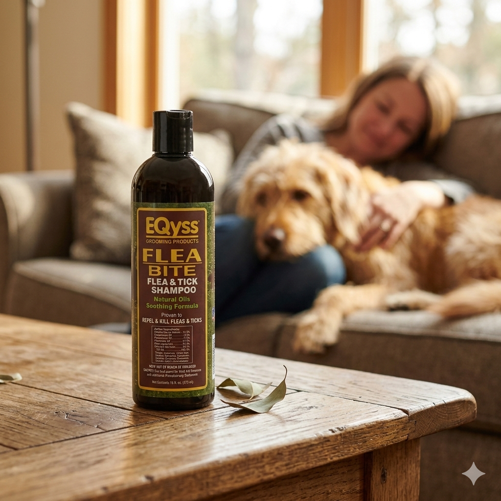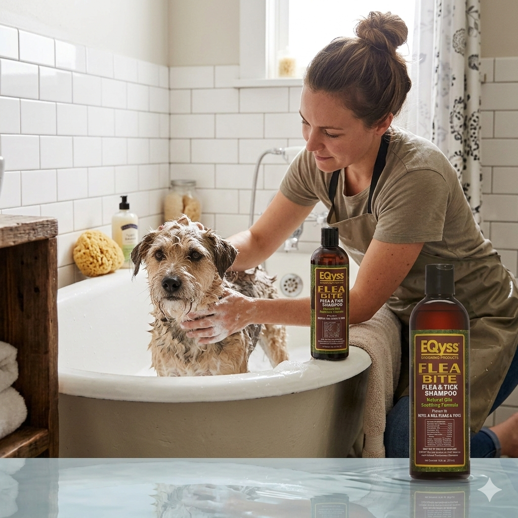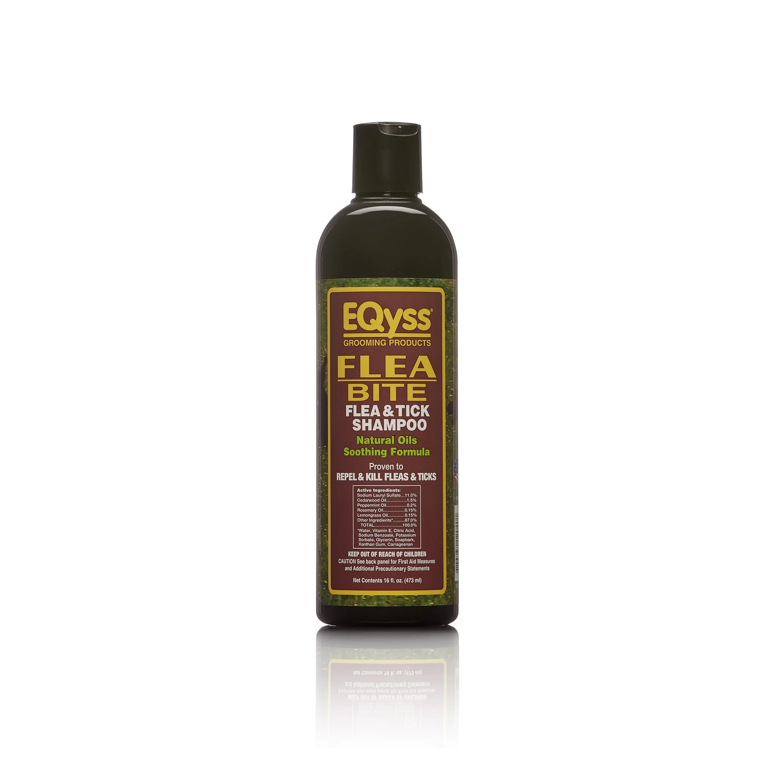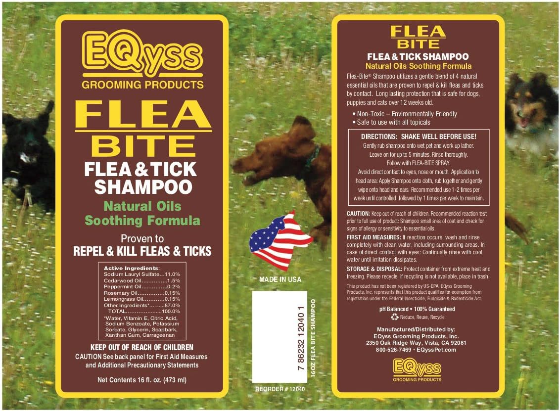 EQyss Flea Bite & Tick Bite Soothing Shampoo (16 oz) is a clinically tested natural pet shampoo proven to kill and repel fleas and ticks. Features a gentle blend of cedarwood, peppermint, rosemary, and lemongrass essential oils. pH balanced to help prevent damage to skin and coat and environmentally friendly. Safe for dogs, puppies, and cats over 12 weeks when used as directed; safe with topicals.